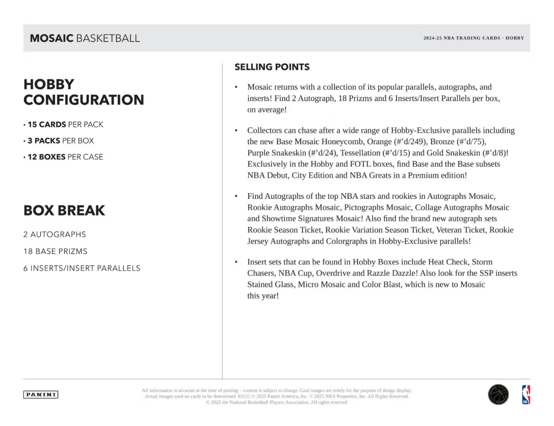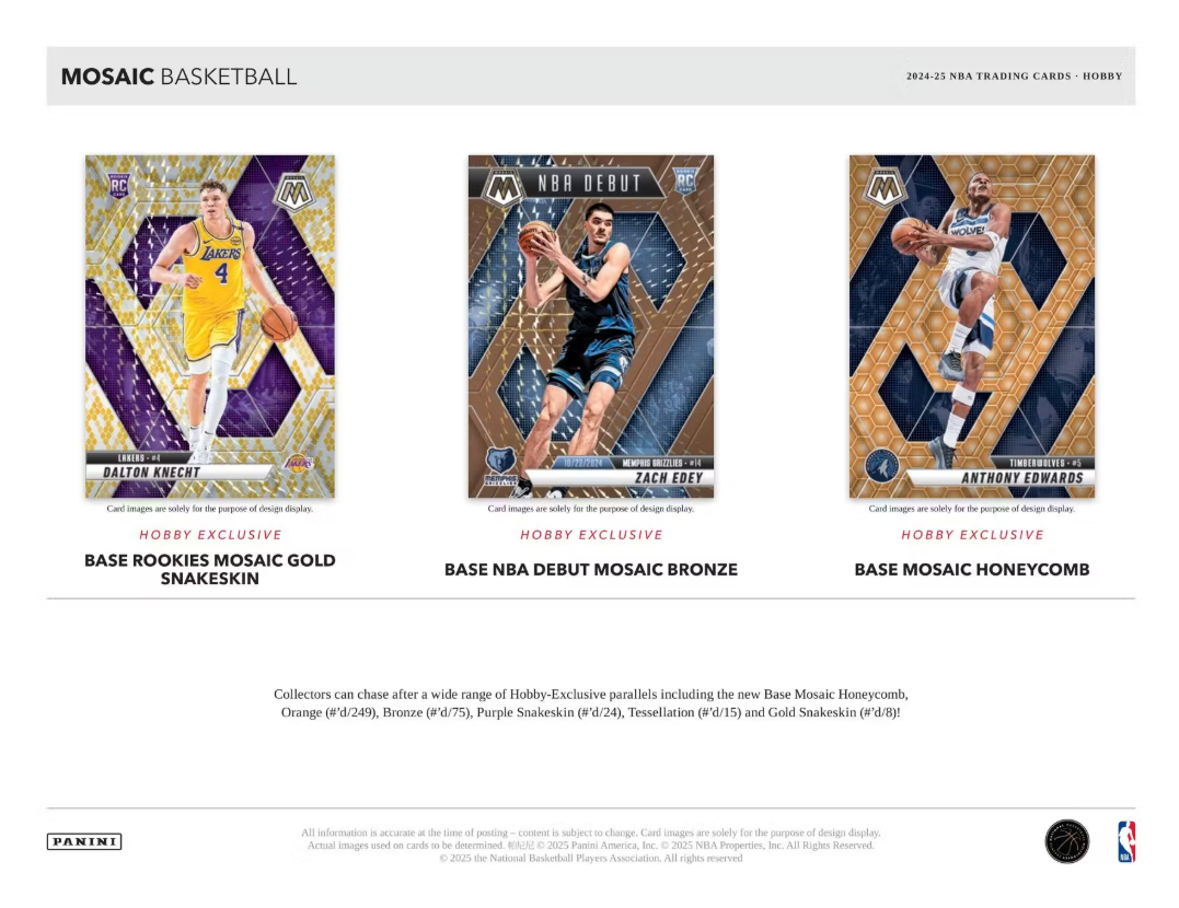 Collectors can chase after a wide range of Hobby-Exclusive parallels including the new Base Mosaic Honeycomb, Orange (#'d/249), Bronze (#'d/75), Purple Snakeskin (#'d/24), Tessellation (#'d/15) and Gold Snakeskin (#'d/8)! Exclusively in the Hobby and FOTL boxes, find Base and the Base subsets NBA Debut, City Edition and NBA Greats in a Premium edition!