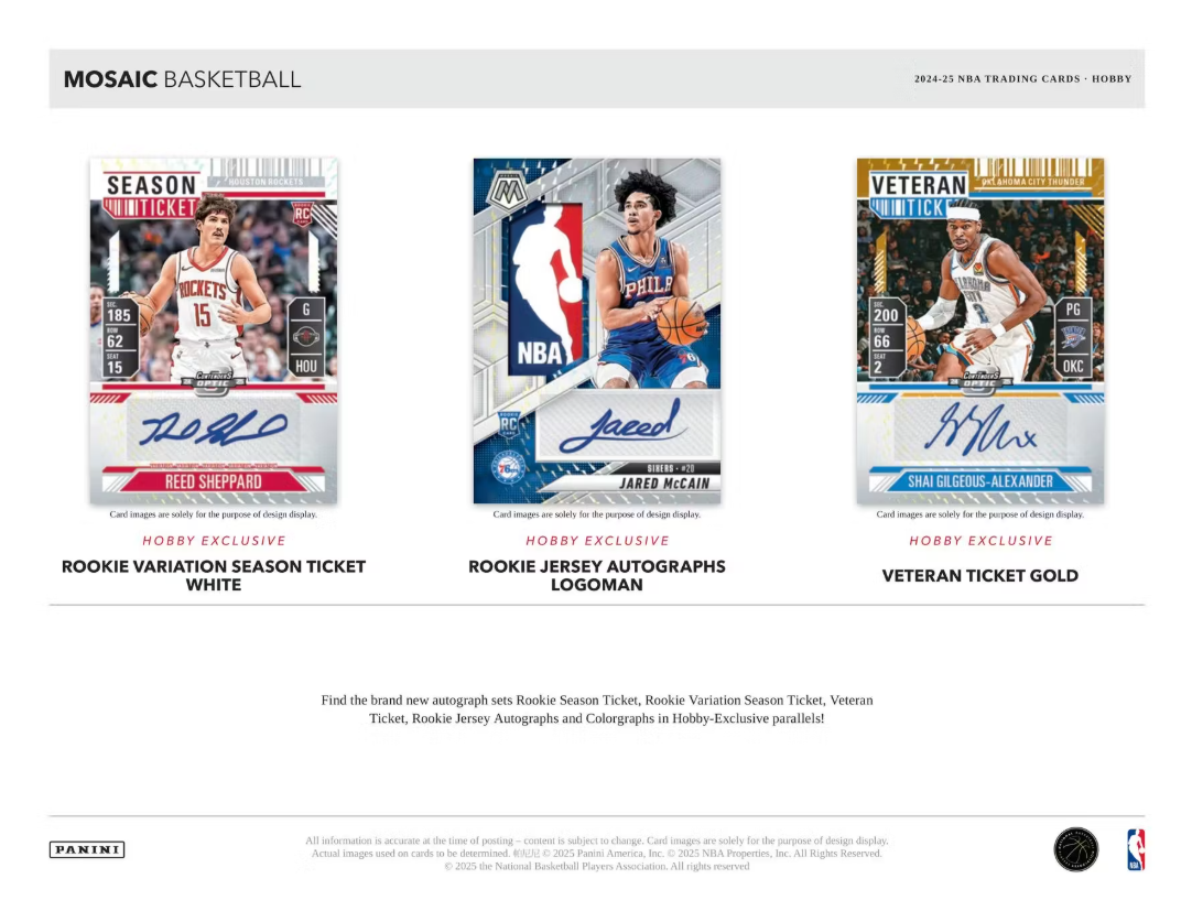 Find Autographs of the top NBA stars and rookies in Autographs Mosaic, Rookie Autographs Mosaic, Pictographs Mosaic, Collage Autographs Mosaic and Showtime Signatures Mosaic! Also find the brand new autograph sets Rookie Season Ticket, Rookie Variation Season Ticket, Veteran Ticket, Rookie Jersey Autographs and Colorgraphs in Hobby-Exclusive parallels!