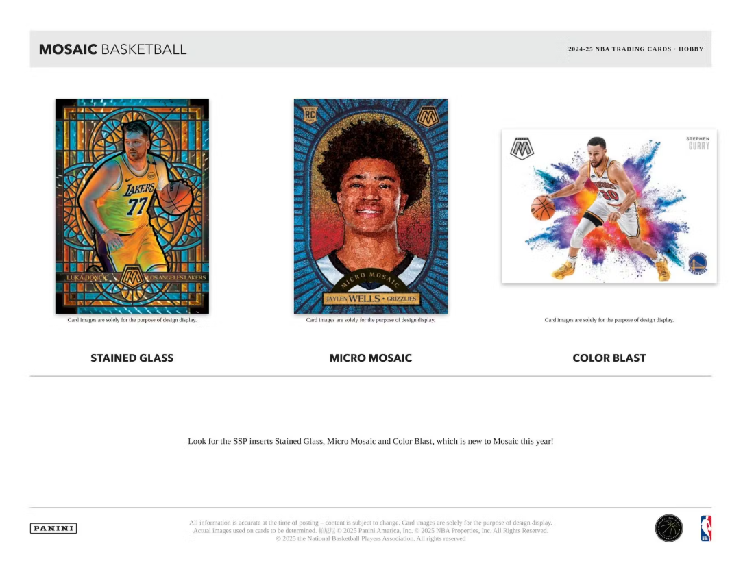 Insert sets that can be found in Hobby Boxes include Heat Check, Storm Chasers, NBA Cup, Overdrive and Razzle Dazzle! Also look for the SSP inserts Stained Glass, Micro Mosaic and Color Blast, which is new to Mosaic this year!