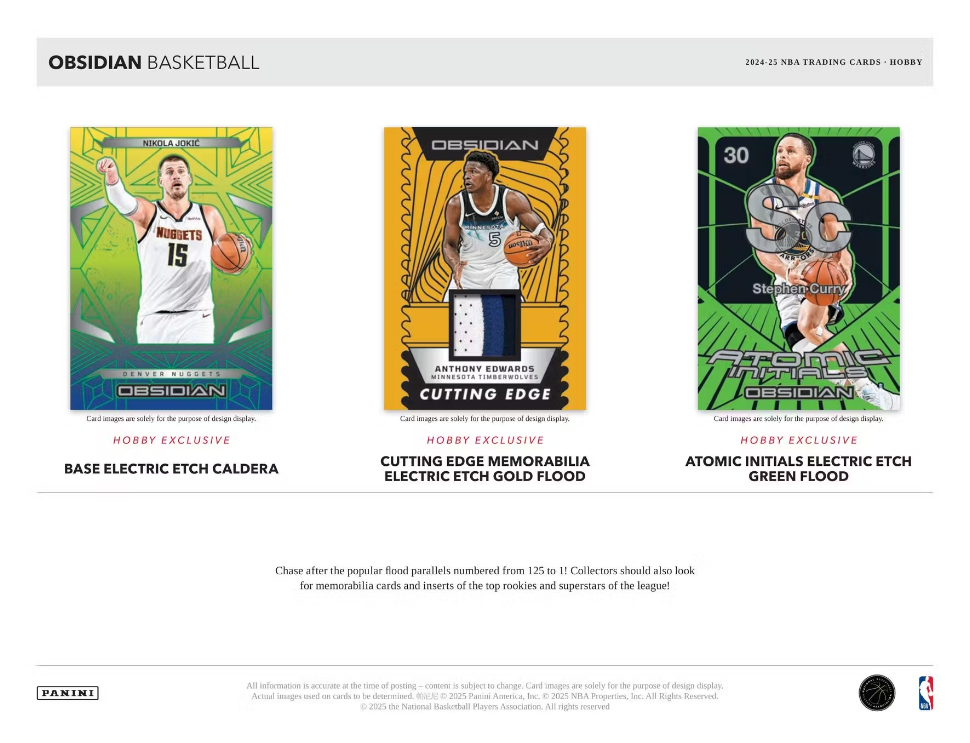 Obsidian returns for another year, offering unique designs, parallels, and die cuts! Find 2 Autographs and 1 Memorabilia card, 3 Inserts/Base Parallels cards, and 1 Base card per box on average!