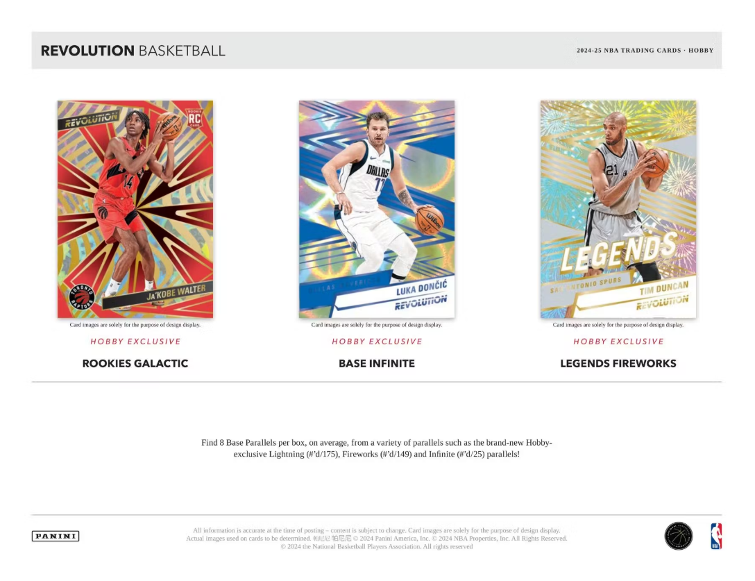 Find 8 Base Parallels per box, on average, from a variety of parallels such as the brand-new Hobby-exclusive Lightning (#'d/175), Fireworks (#'d/149) and Infinite (#'d/25) parallels!