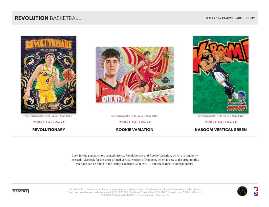 Each Hobby Box includes 4 Inserts/Insert Parallels! Look for the popular short-printed inserts, Revolutionary and Rookie Variation, which are randomly inserted! Also look for the short-printed vertical version of Kaboom, which is new to the program this year and can be found in the Hobby-Exclusive Gold (#'d/10) and Black (one-of-one) parallels!
