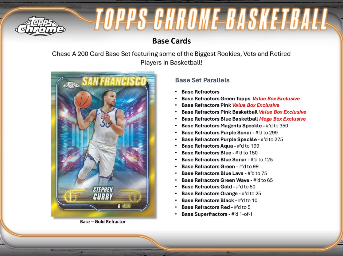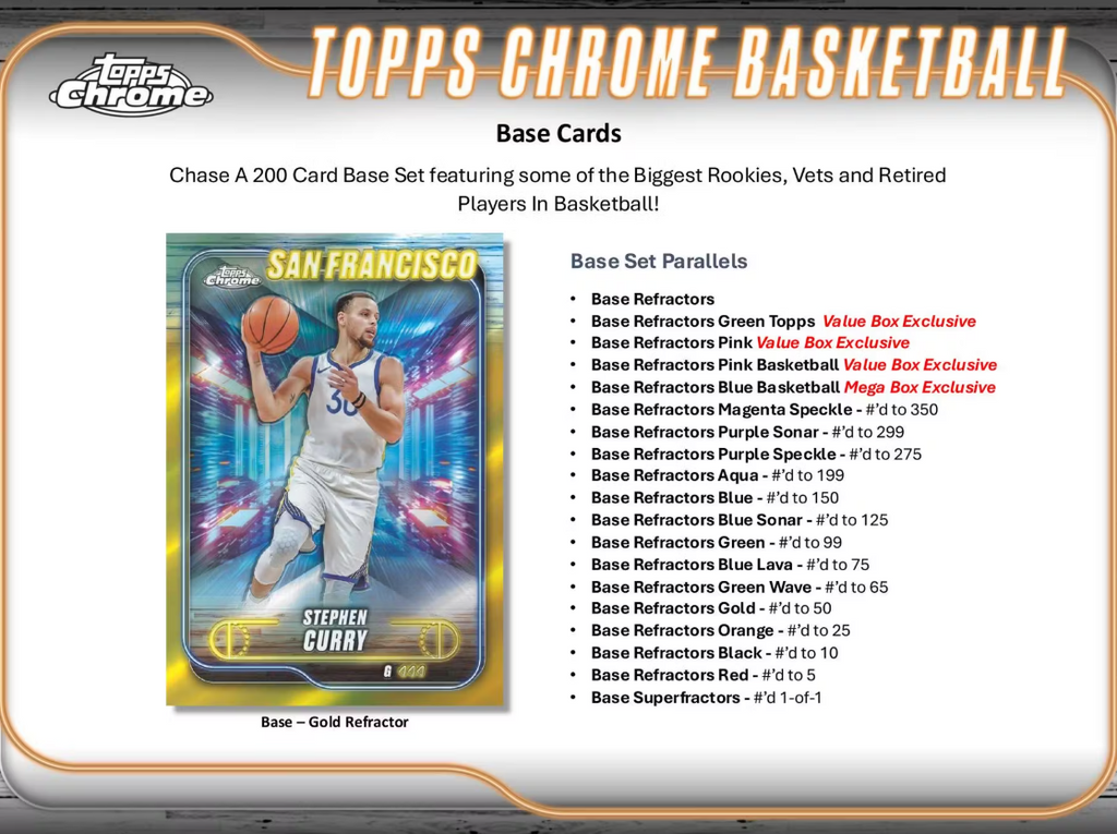 After Exploding back into the Hobby, Topps Chrome Basketball is back in 2025! Find and collect a 200 card Base set featuring some of the top Rookie, Vets and Retired players in Basketball!
