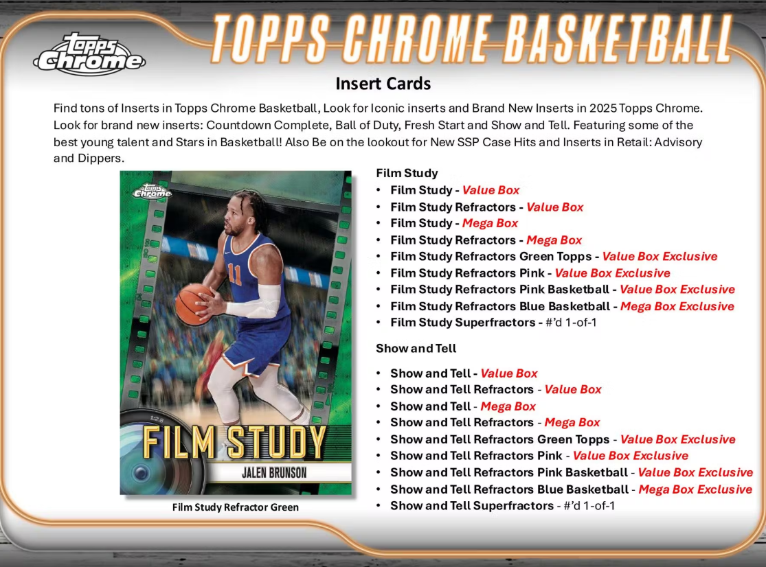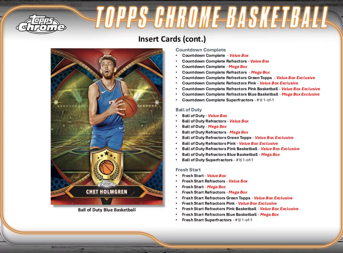 Find tons of Inserts in Topps Chrome Basketball, Look for Iconic inserts and Brand New Inserts in 2025 Topps Chrome. Look for brand new inserts: Countdown Complete, Ball of Duty, Fresh Start and Show and Tell. Featuring some of the best young talent and Stars in Basketball! Also Be on the lookout for New SSP Case Hits and Inserts in