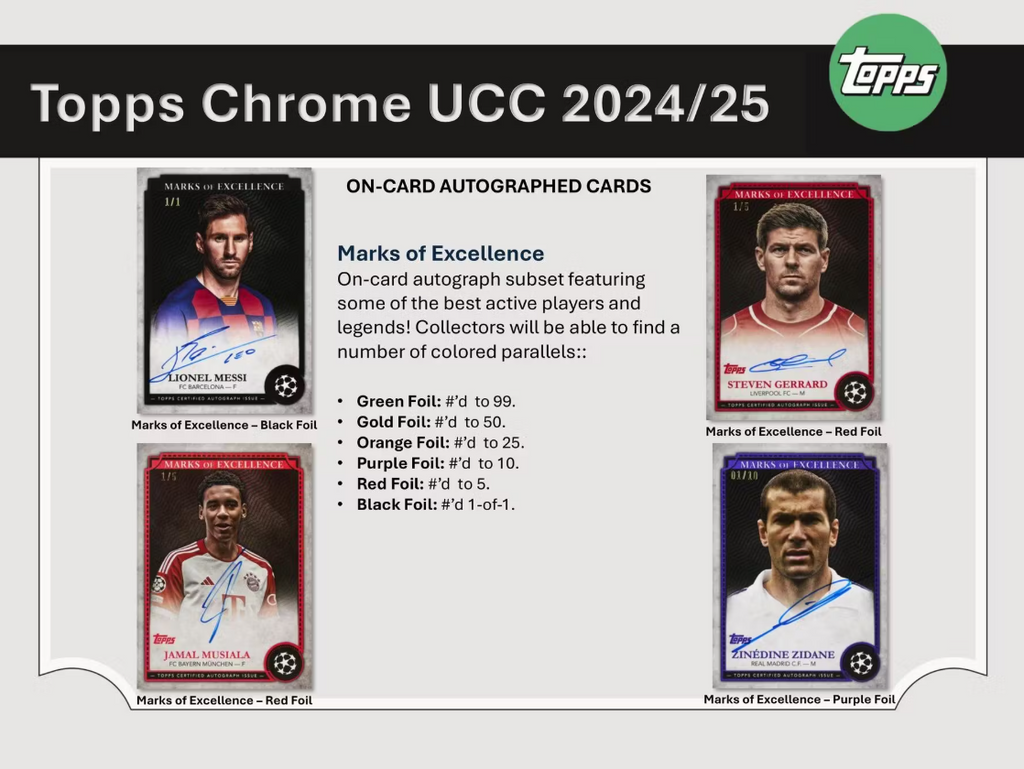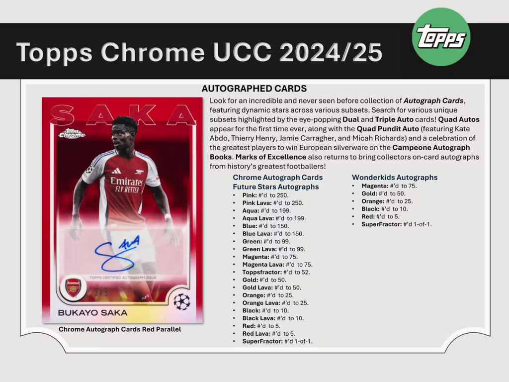 Look for an incredible and never seen before collection of Autograph Cards, featuring dynamic stars across various subsets. Search for various unique subsets highlighted by the eye-popping Dual and Triple Auto cards! Quad Autos appear for the first time ever, along with the Quad Pundit Auto (featuring Kate Abdo, Thierry Henry, Jamie Carragher, and Micah Richards) and a celebration of the greatest players to win European silverware on the Campeone Autograph Books. Marks of Excellence also returns to bring collectors on-card autographs from history's greatest footballers!