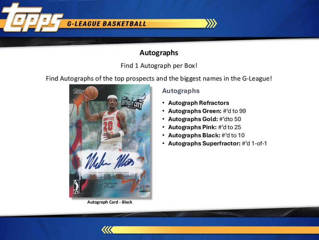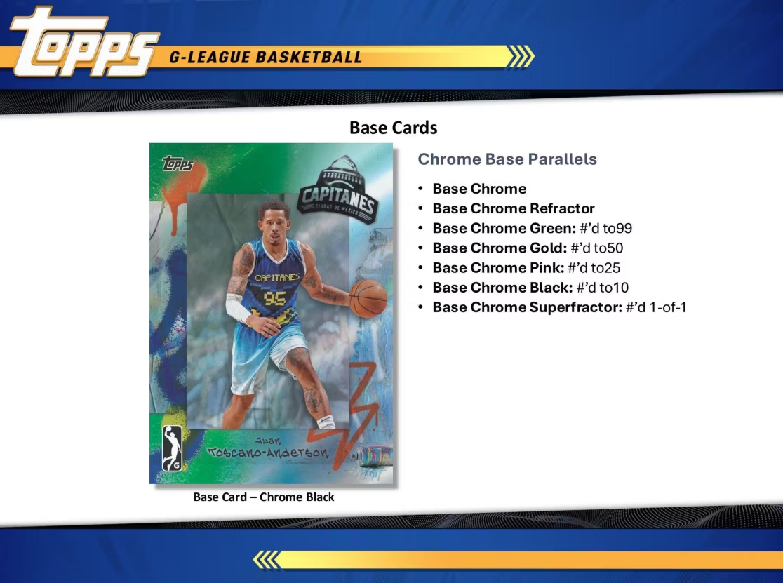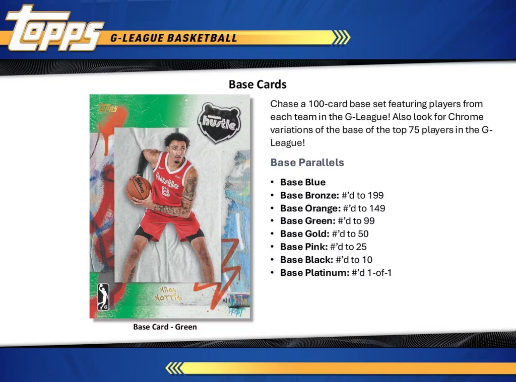 Topps G-League Basketball is back in 2025! Collect all the top young players looking to take the next step on their paths to NBA Fame. Chase players from each team in the 100- card Base checklist or look for the top players from each team in our SSP inserts!