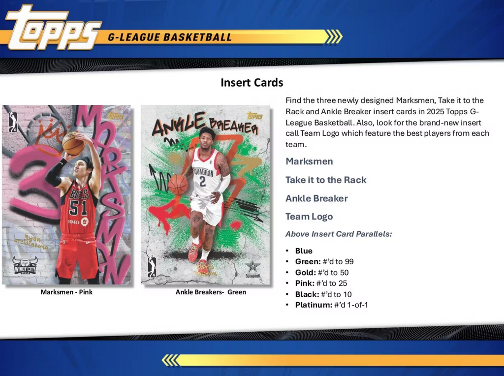 Find the three newly designed Marksmen, Take it to the Rack and Ankle Breaker insert cards in 2025 Topps GLeague Basketball. Also, look for the brand-new insert call Team Logo which feature the best players from each team.