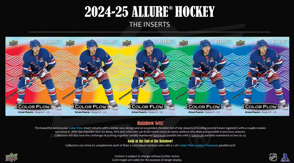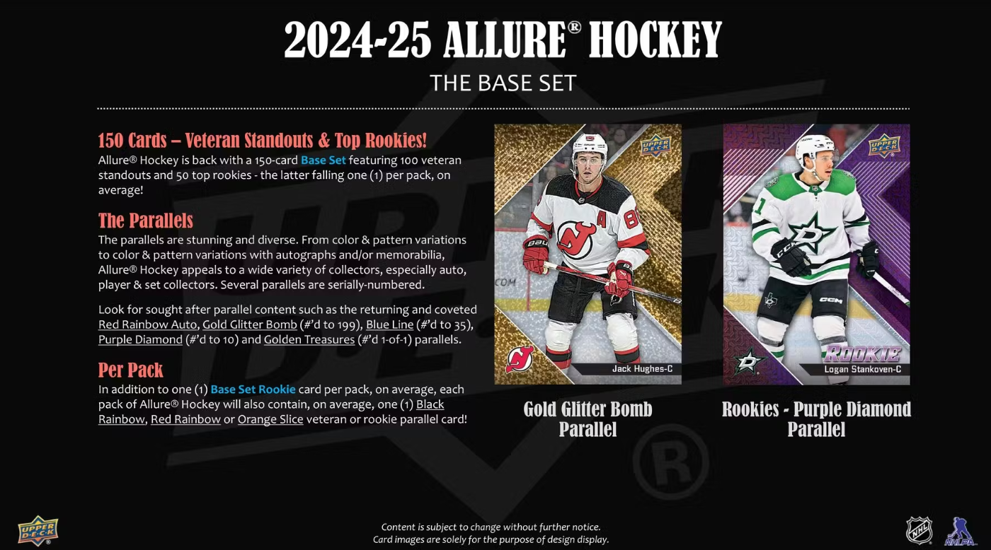 THE BASE SET: Allure Hockey returns with a 150-card Base Set consisting of 100 veteran standouts and 50 rookies - the latter falling one (1) per pack, on average. From the popular Black Rainbow, Red Rainbow, Red Rainbow Auto and Orange Slice parallels to the coveted 1-of-1 Golden Treasures and Golden Treasures Auto parallels, the Base Set lineup is deep and full of chase cards! The product also includes the Base Set Printing Plates.