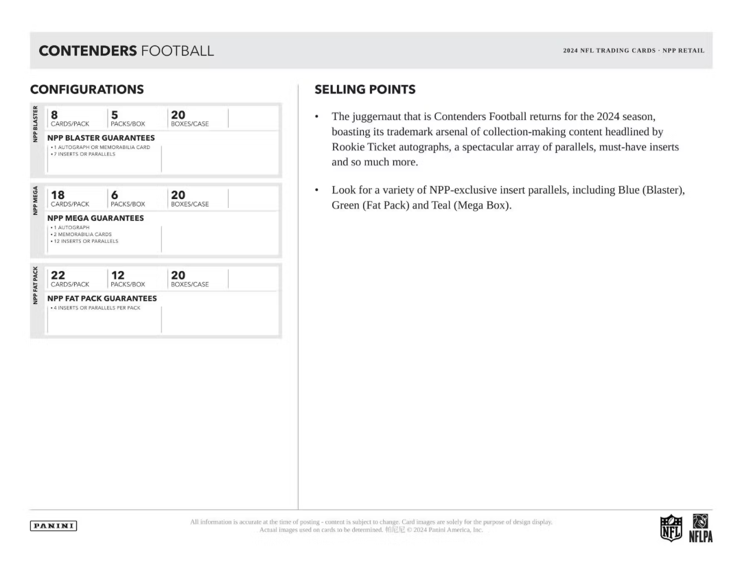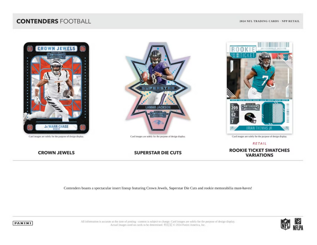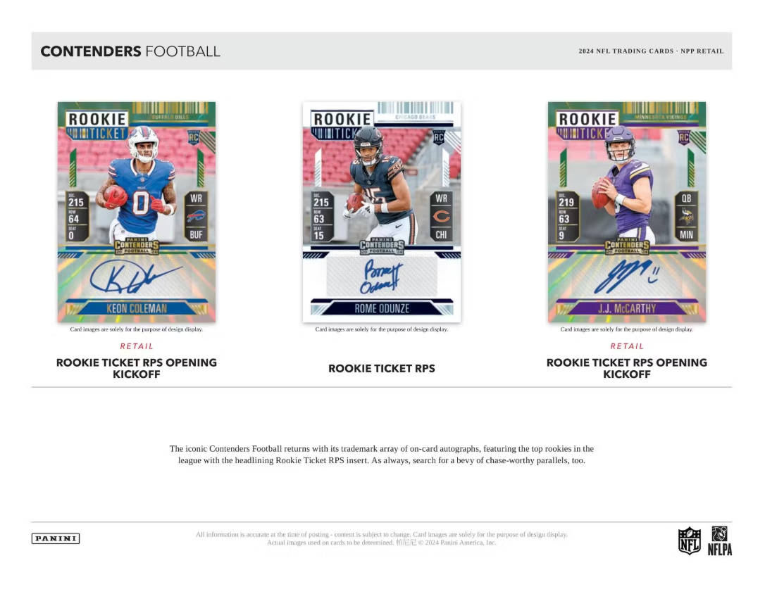 The juggernaut that is Contenders Football returns for the 2024 season, boasting its trademark arsenal of collection-making content headlined by Rookie Ticket autographs, a spectacular array of parallels, must-have inserts and so much more.