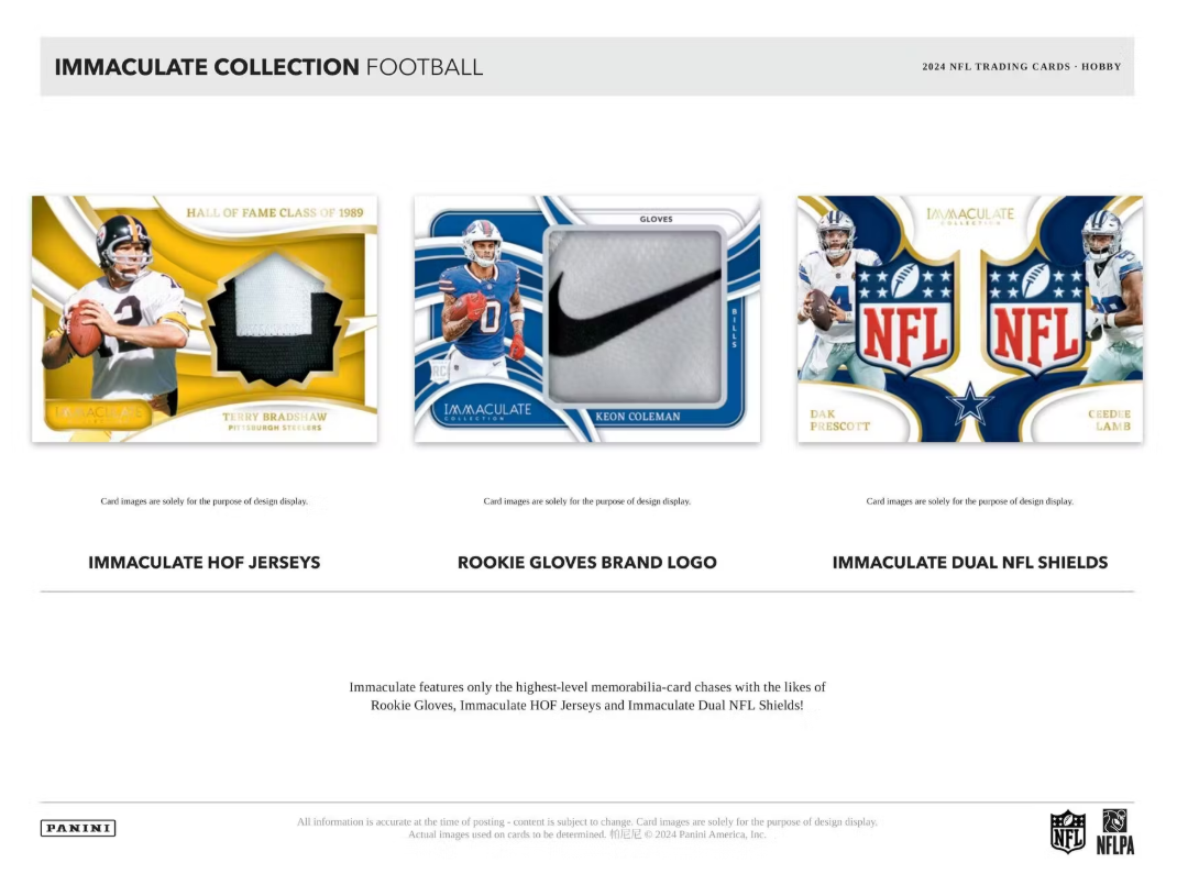 Immaculate features only the highest-level memorabilia-card chases from the highly desired Rookie Logos to Immaculate HOF Jerseys and Immaculate Dual NFL Shields.
