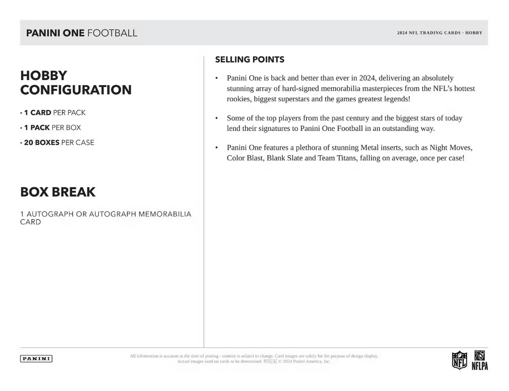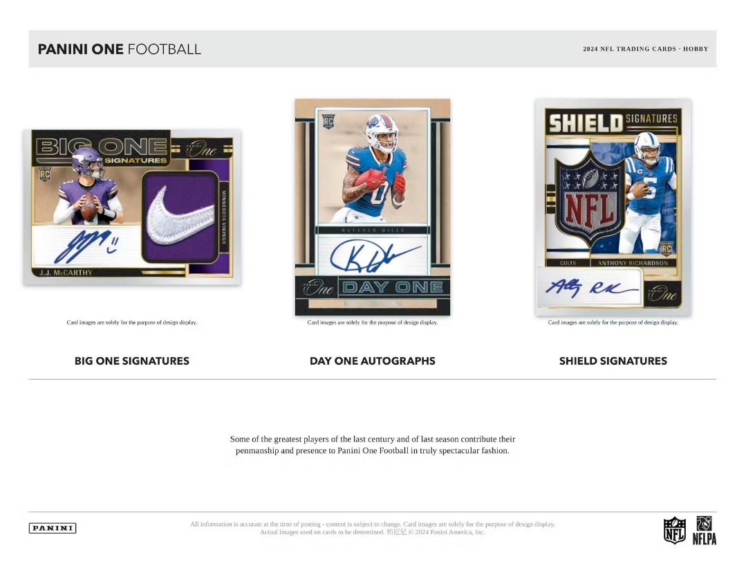 Panini One is back and better than ever in 2024, delivering an absolutely stunning array of hard-signed memorabilia masterpieces from the NFL's hottest rookies, biggest superstars, and the games greatest legends!