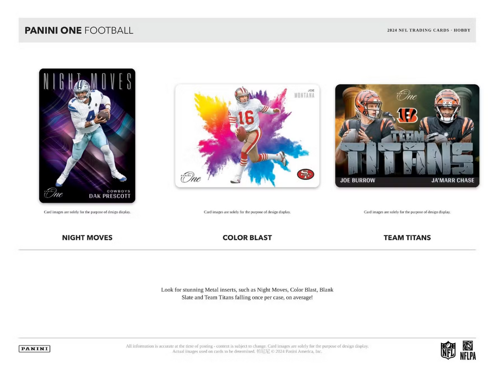 Panini One features a plethora of stunning Metal inserts, such as Night Moves, Color Blast, Blank Slate and Team Titans, falling on average, once per case!