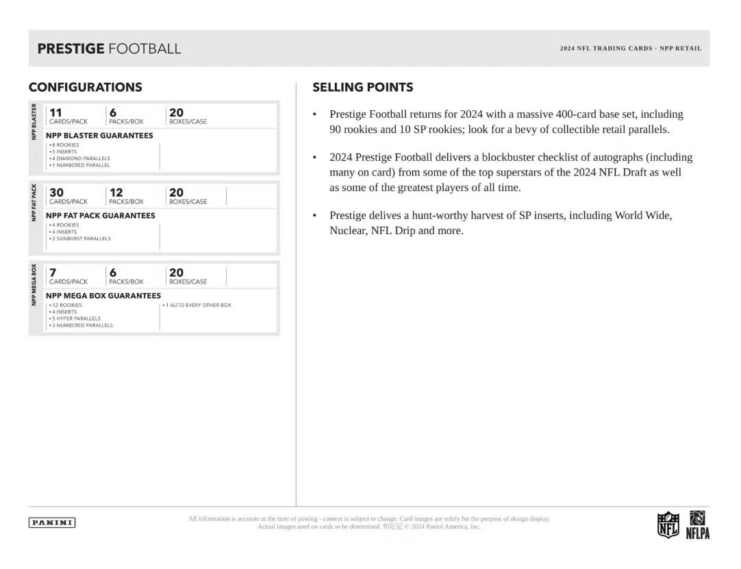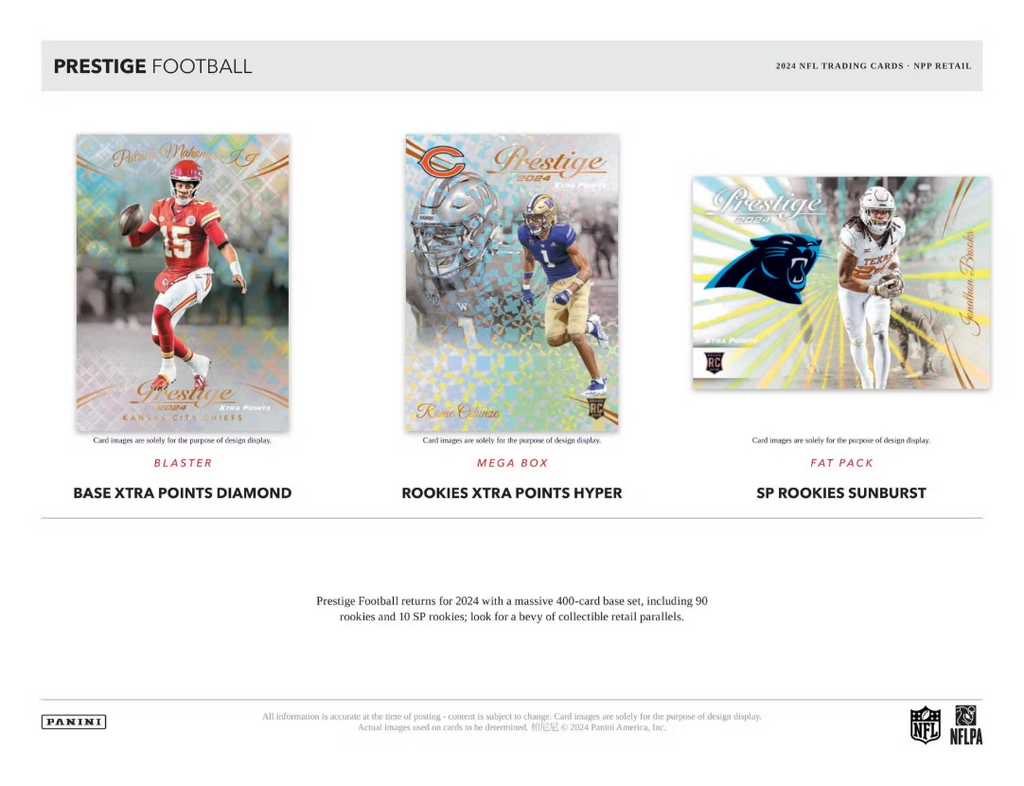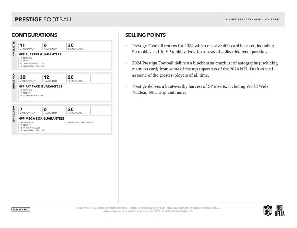 Prestige Football returns for 2024 with a massive 400-card base set, including 90 rookies and 10 SP rookies; look for a bevy of collectible retail parallels.