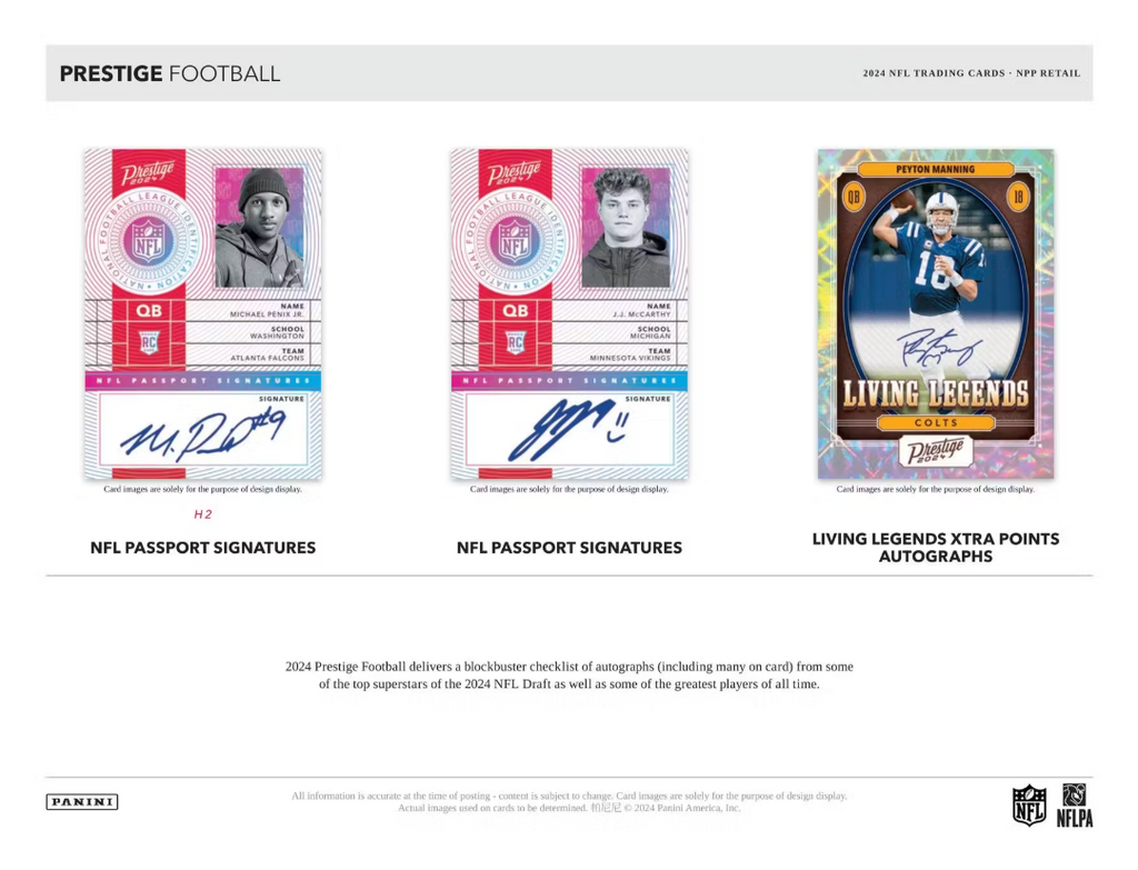 AUTOGRAPHS: 2024 Prestige Football delivers a blockbuster checklist of autographs (including many on card) from some of the top superstars of the 2024 NFL Draft as well as some of the greatest players of all time.