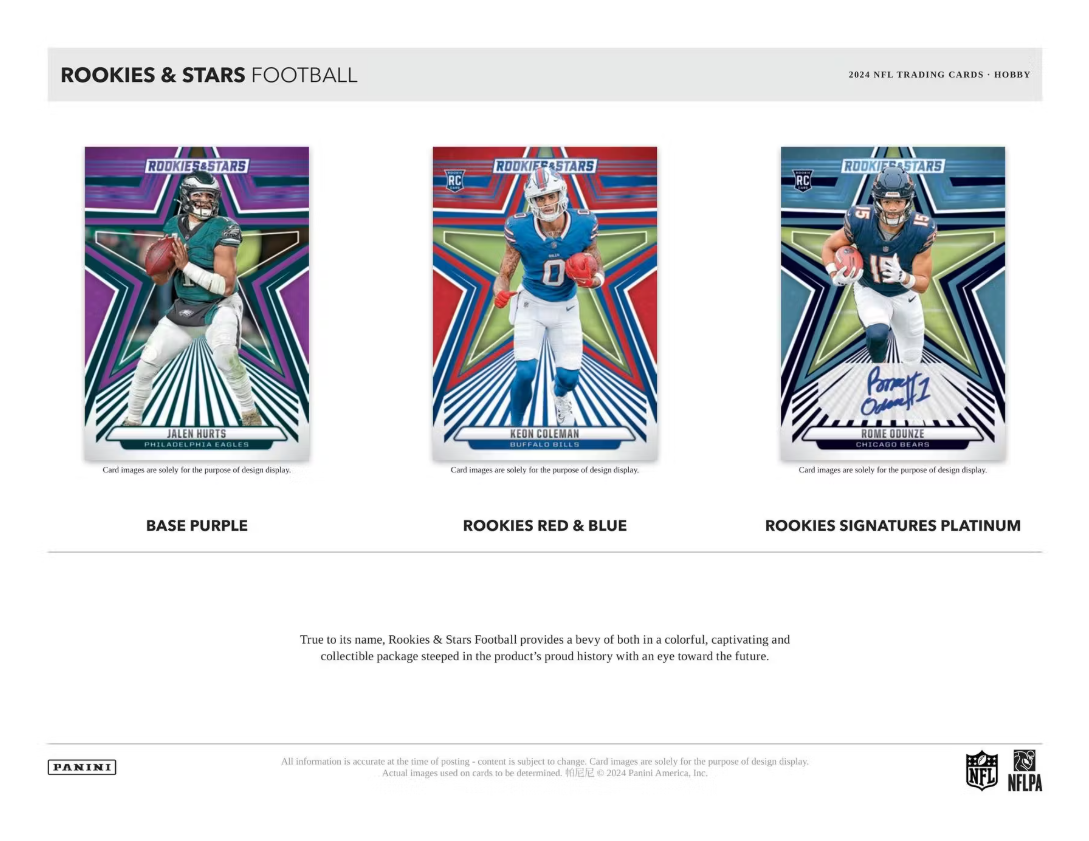 From current stars to the most potential-packed newcomers, 2024 Rookies & Stars Football packs a punch with powerful autograph-memorabilia combinations and chase-worthy inserts.