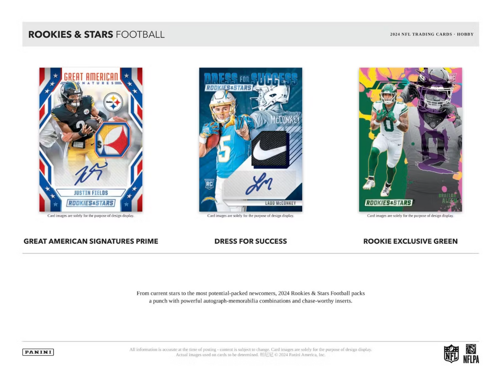 GREAT AMERICAN SIGNATURES / DRESS FOR SUCCESS / ROOKIE EXCLUSIVE: From current stars to the most potential-packed newcomers, 2024 Rookies & Stars Football packs a punch with powerful autograph-memorabilia combinations and chase-worthy inserts.