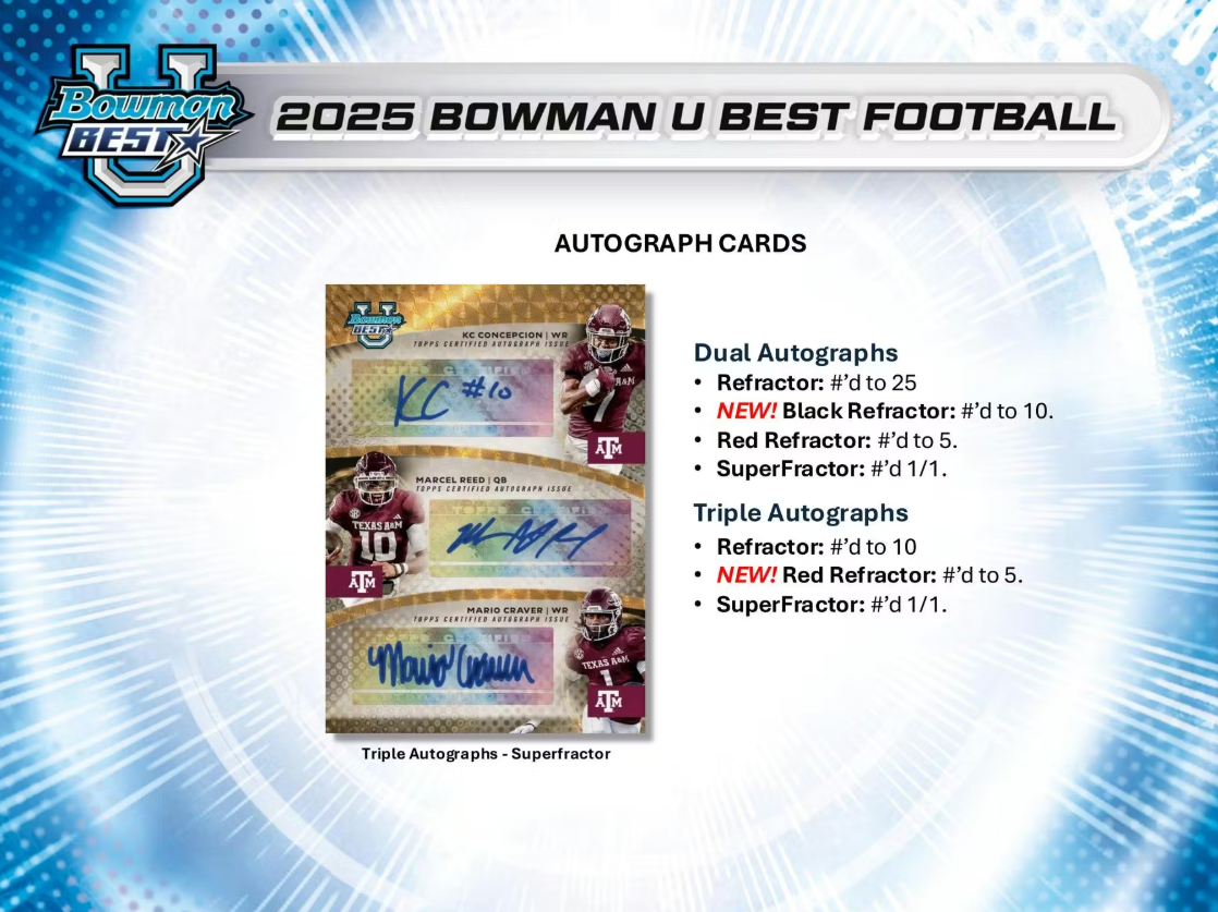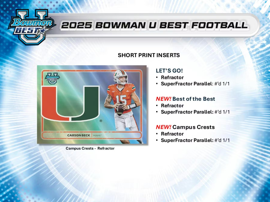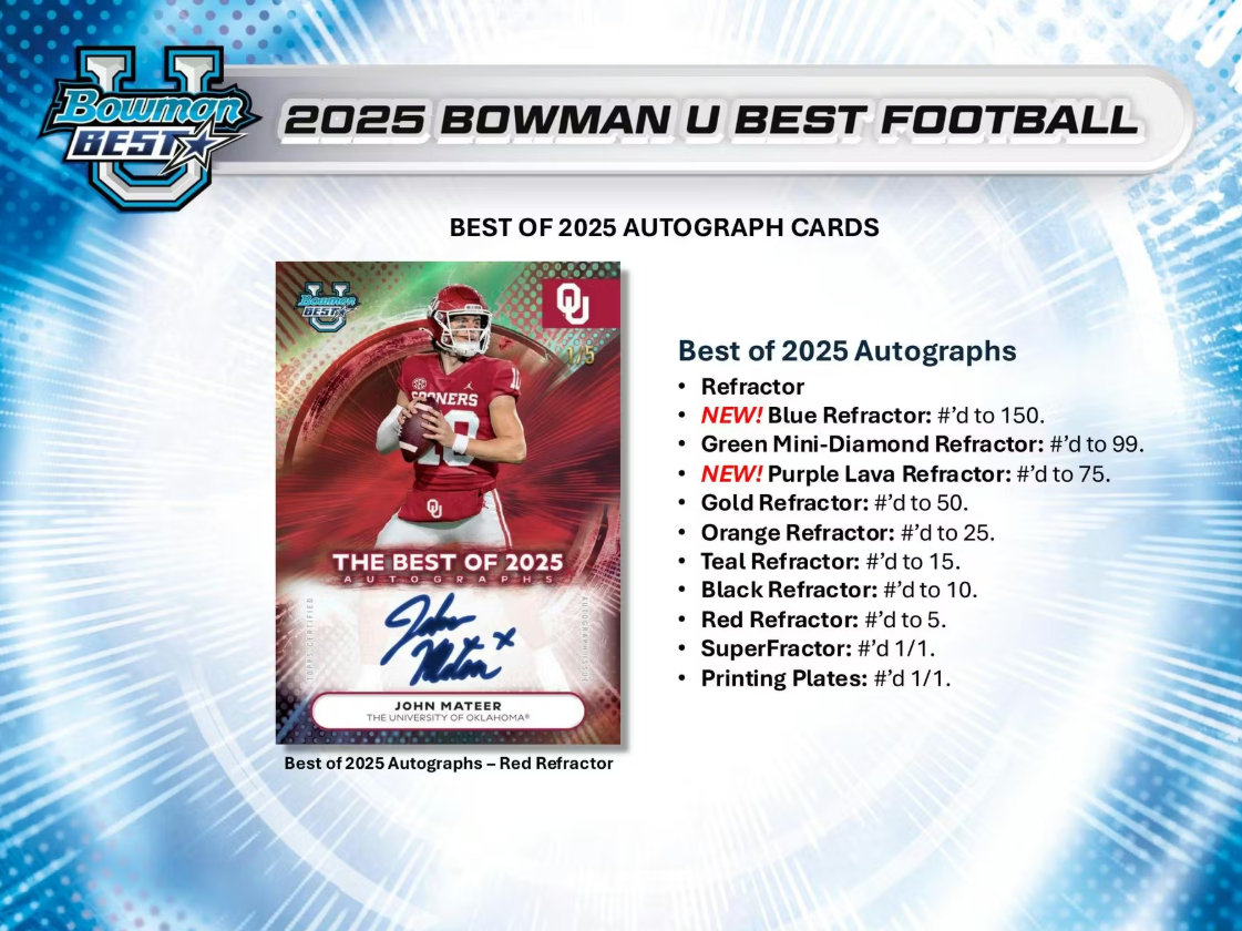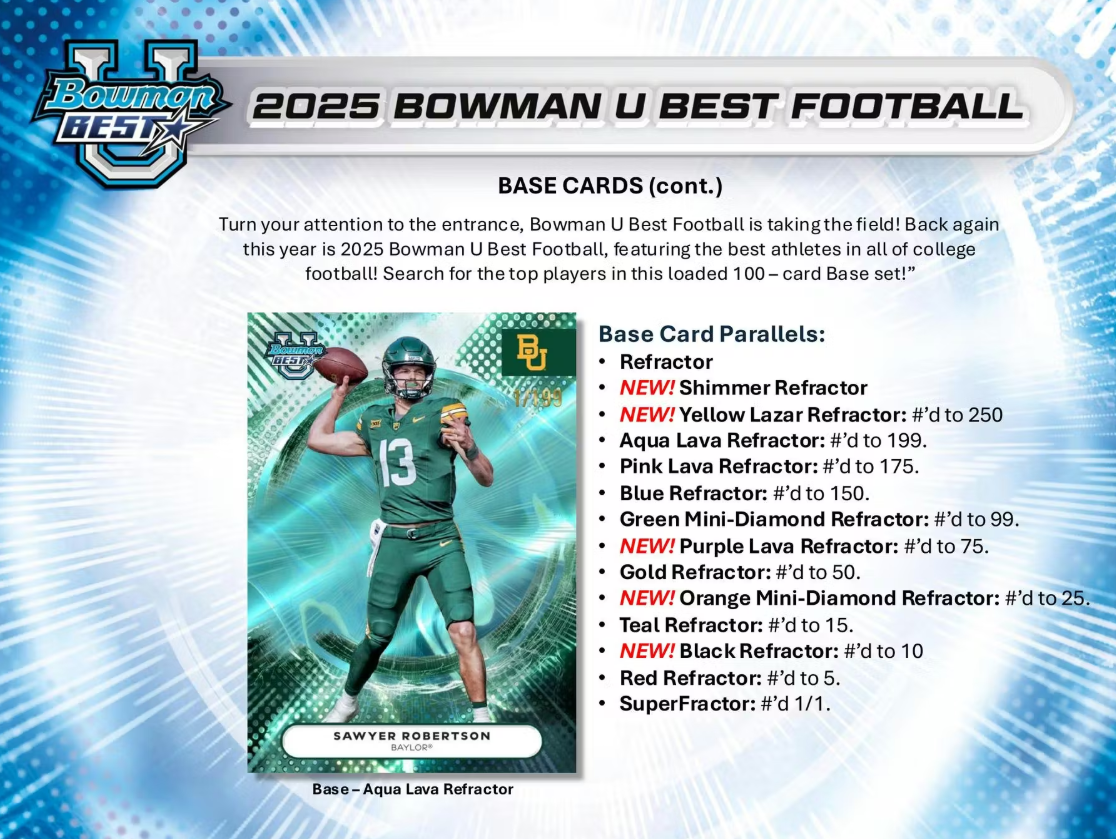 Turn your attention to the entrance, Bowman U Best Football is taking the field! Back again this year is 2025 Bowman U Best Football, featuring the best athletes in all of college football! Search for the top players in this loaded 100 - card Base set!"