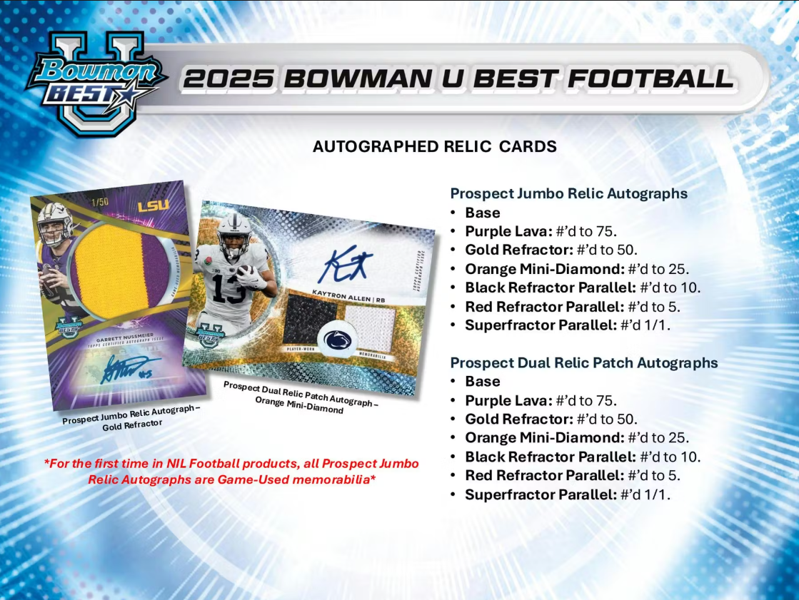 Signature content takes it up a notch with Best of 2025 Autographs featuring 100 top prospects, alongside all-new Greatness Awaits and Workhorse Signatures that spotlight defining moments and future stars. Triple and Dual Autographs, each with limited parallels, offer once-in-a-Hobby combinations, while Jumbo Relic Autographs debut the first-ever Game-Used relic autos in an NIL football product. These hobby-only cards combine authentic game-used memorabilia with autographs from the college game's brightest names, delivering unmatched authenticity and collector appeal. Dual relic autos with low-numbered patch parallels bring even more heat to this historic checklist.
