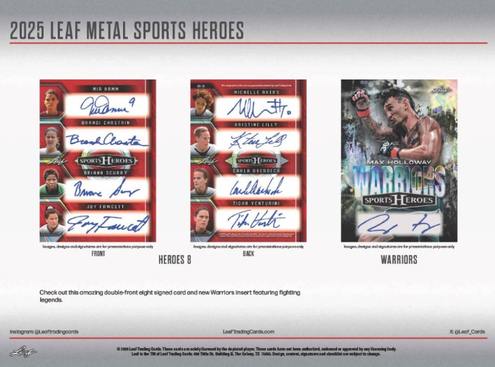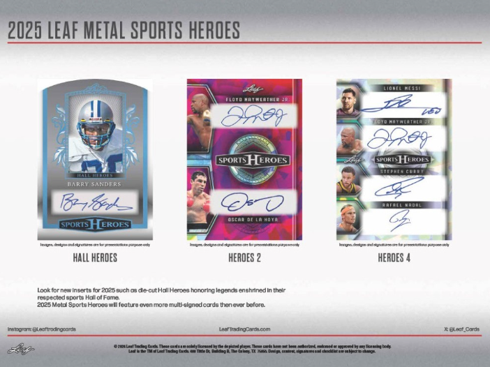 HALL HEROES / HEROES 2 / HEROES 4: Look for new inserts for 2025 such as die-cut Hall Heroes honoring legends enshrined in their respected sports Hall of Fame. 2025 Metal Sports Heroes will feature even more multi-signed cards then ever before.