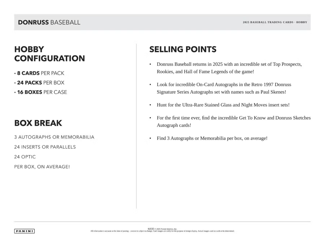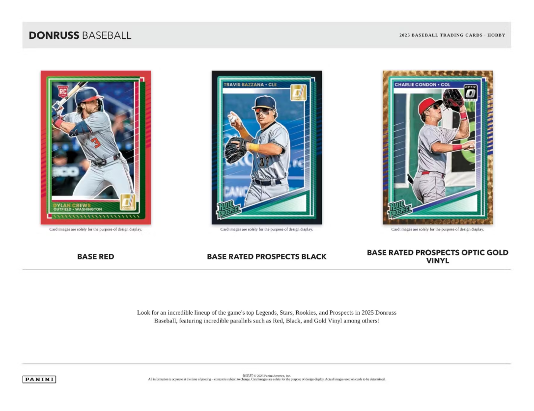 Donruss Baseball returns in 2025 with an incredible set of Top Prospects, Rookies, and Hall of Fame Legends of the game!