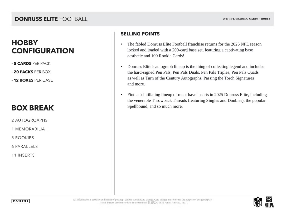 The fabled Donruss Elite Football franchise returns for the 2025 NFL season locked and loaded with a 200-card base set, featuring a captivating base aesthetic and 100 Rookie Cards!