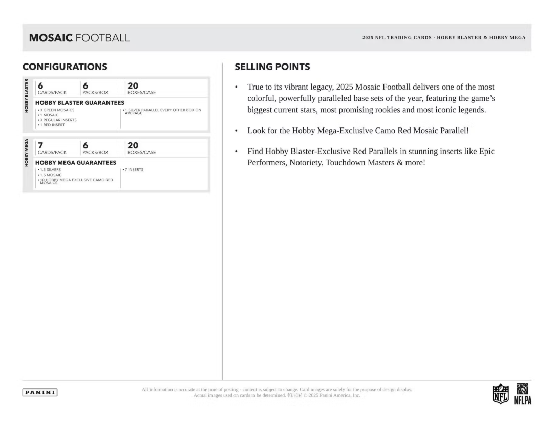 True to its vibrant legacy, 2025 Mosaic Football delivers one of the most colorful, powerfully paralleled base sets of the year, featuring the game's biggest current stars, most promising rookies and most iconic legends.
