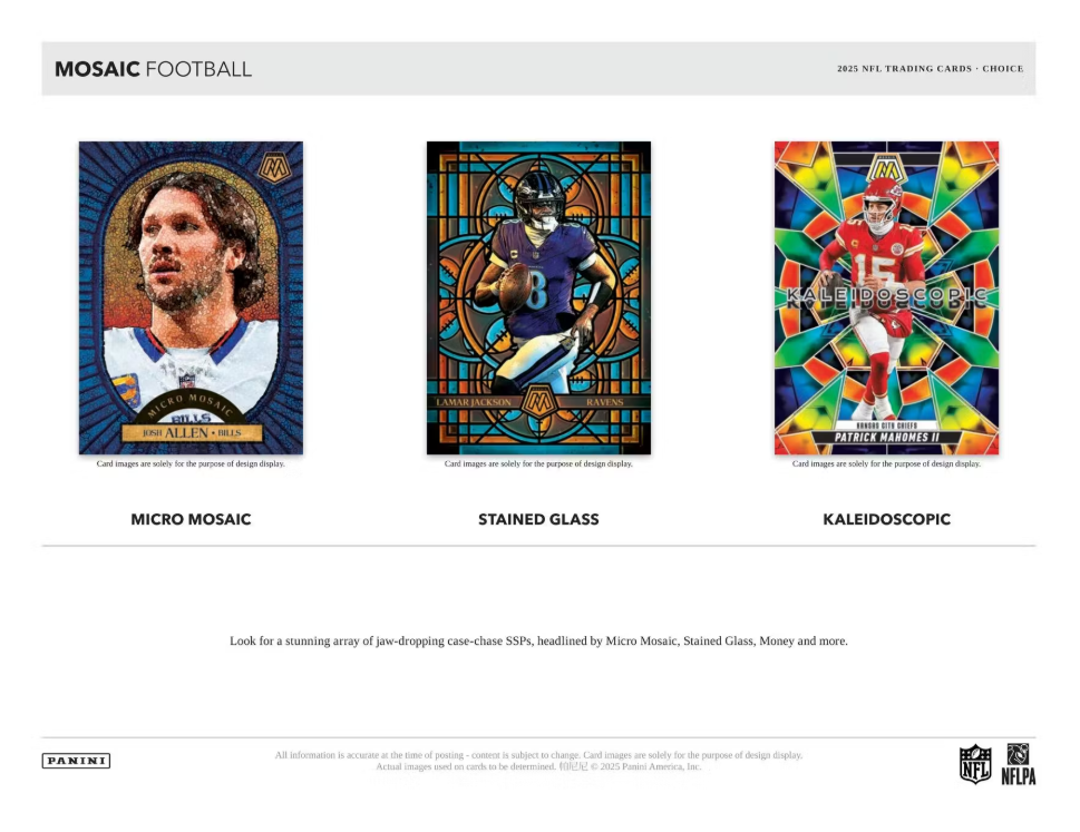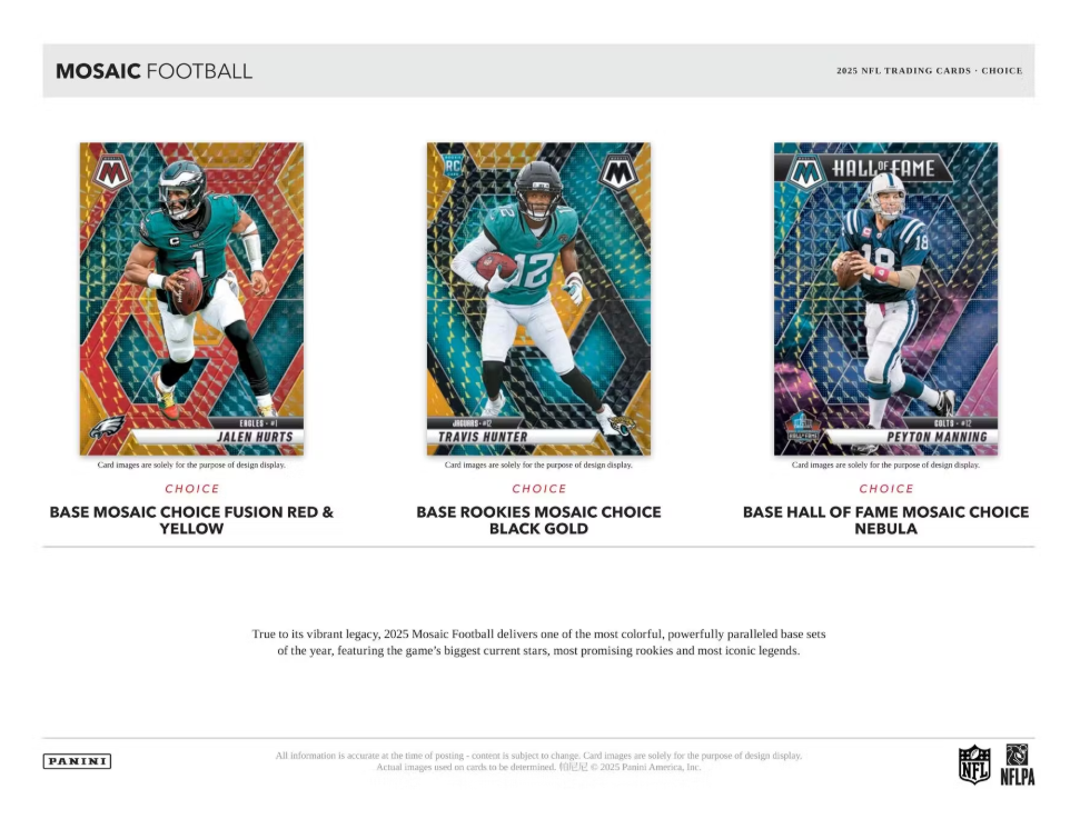 True to its vibrant legacy, 2025 Mosaic Football delivers one of the most colorful, powerfully paralleled base sets of the year, featuring the game's biggest current stars, most promising rookies and most iconic legends.