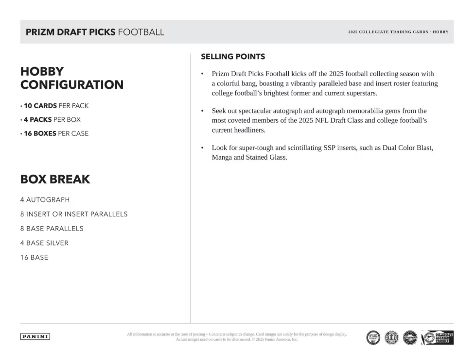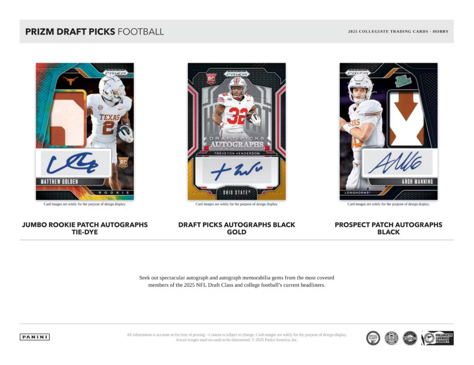 Prizm Draft Picks Football kicks off the 2025 football collecting season with a colorful bang, boasting a vibrantly paralleled base and insert roster featuring college football's brightest former and current superstars.