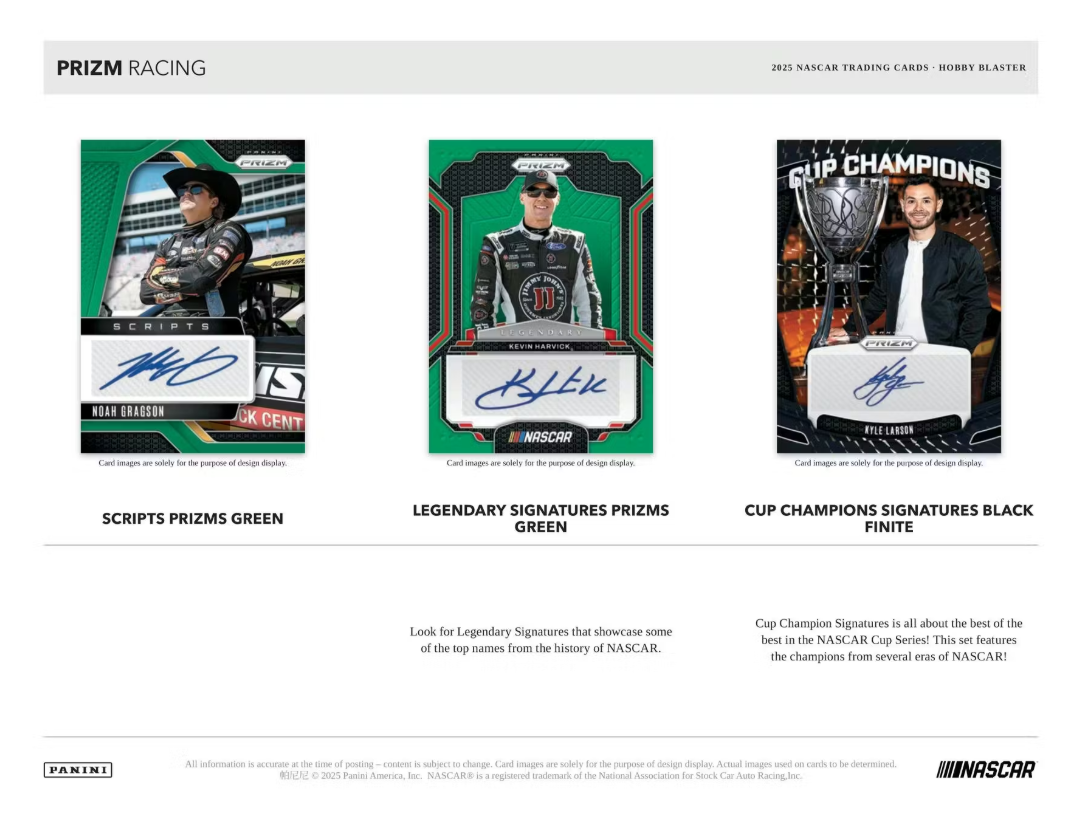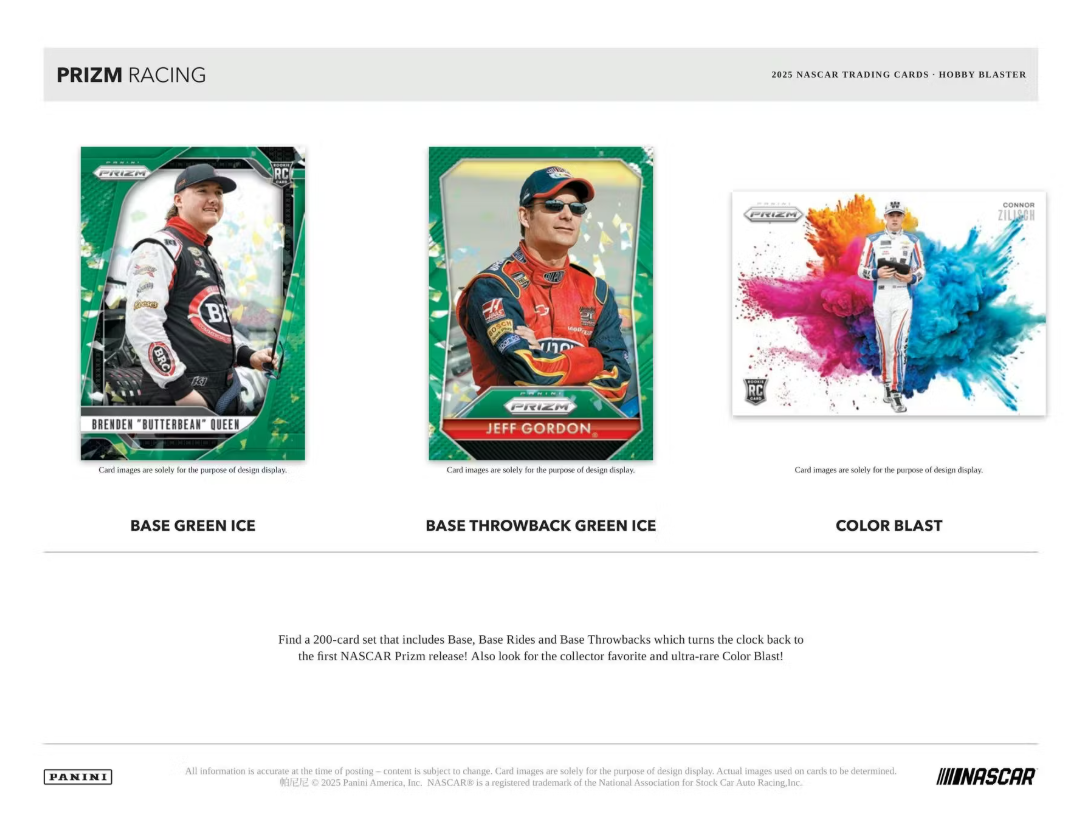 Find a 200-card set that includes Base, Base Rides and Base Throwbacks which turns the clock back to the first NASCAR Prizm release! Also look for the collector favorite and ultra-rare Color Blast!