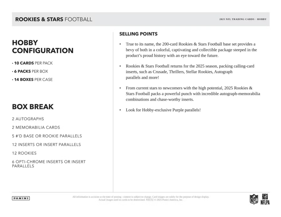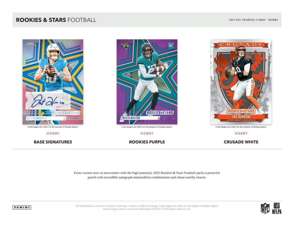Rookies & Stars Football returns for the 2025 season, packing calling-card inserts, such as Crusade, Thrillers, Stellar Rookies, Autograph parallels and more!