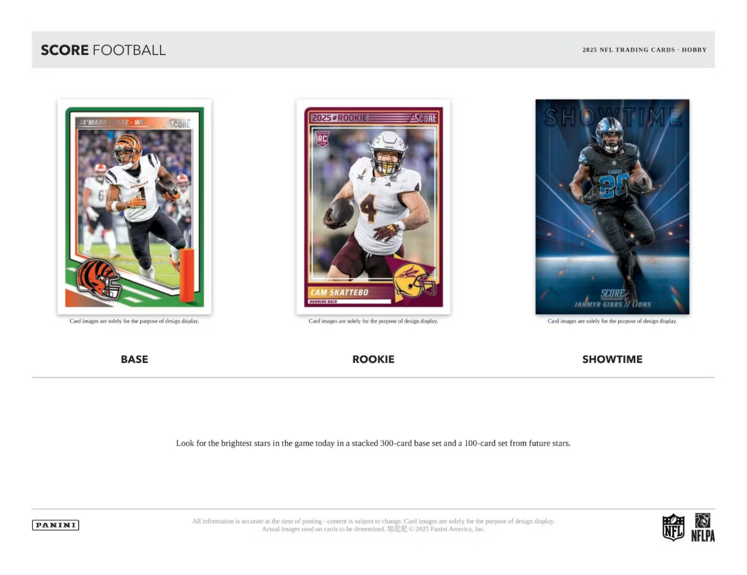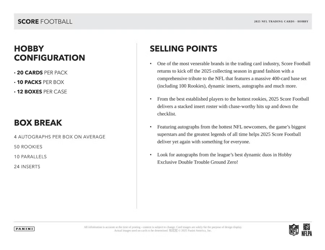 One of the most venerable brands in the trading card industry, Score Football returns to kick off the 2025 collecting season in grand fashion with a comprehensive tribute to the NFL that features a massive 400-card base set (including 100 Rookies), dynamic inserts, autographs and much more.