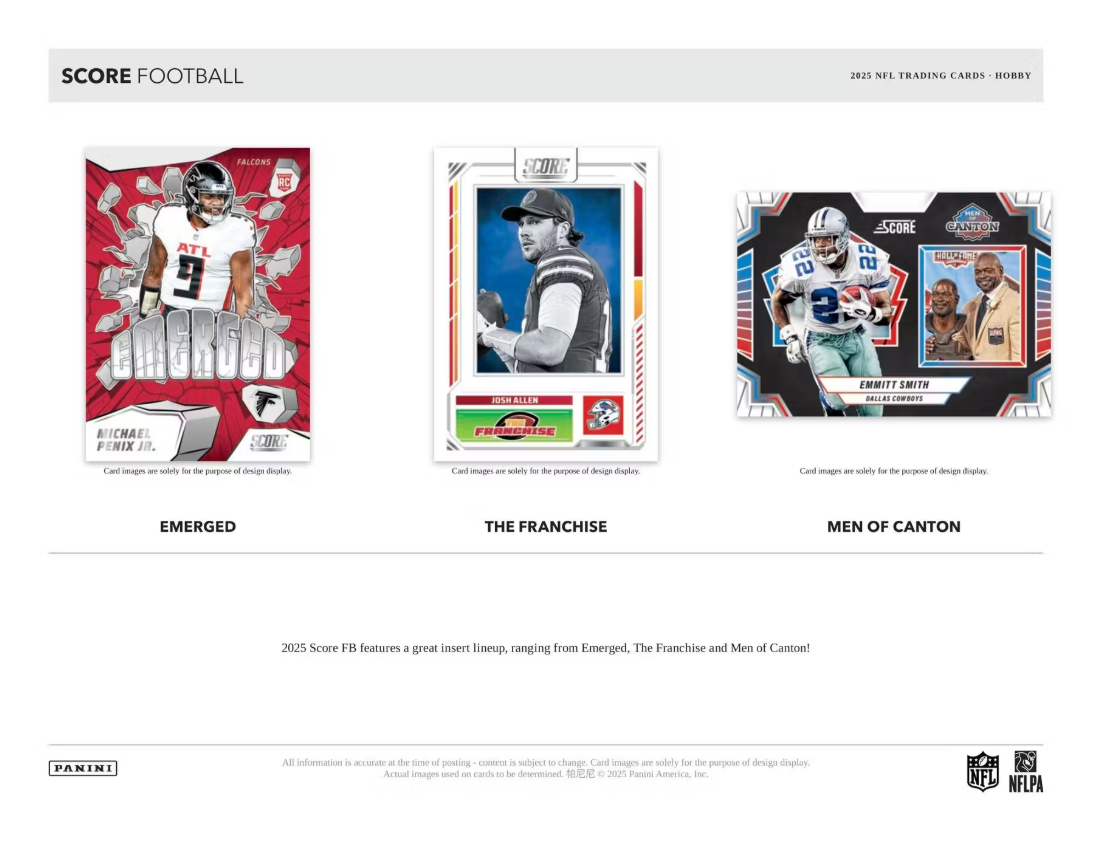 2025 Score FB features a great insert lineup, ranging from Emerged, The Franchise and Men of Canton!