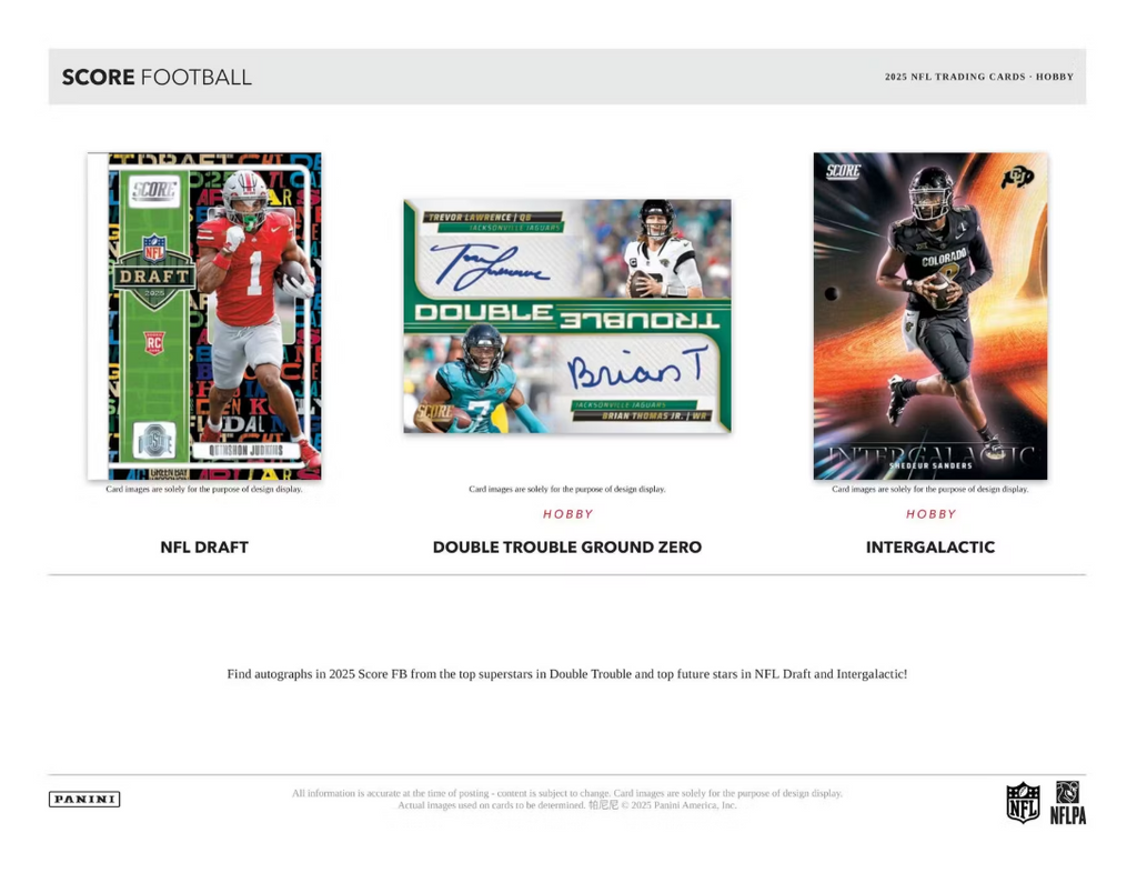 Find autographs in 2025 Score FB from the top superstars in Double Trouble and top future stars in NFL Draft and Intergalactic!