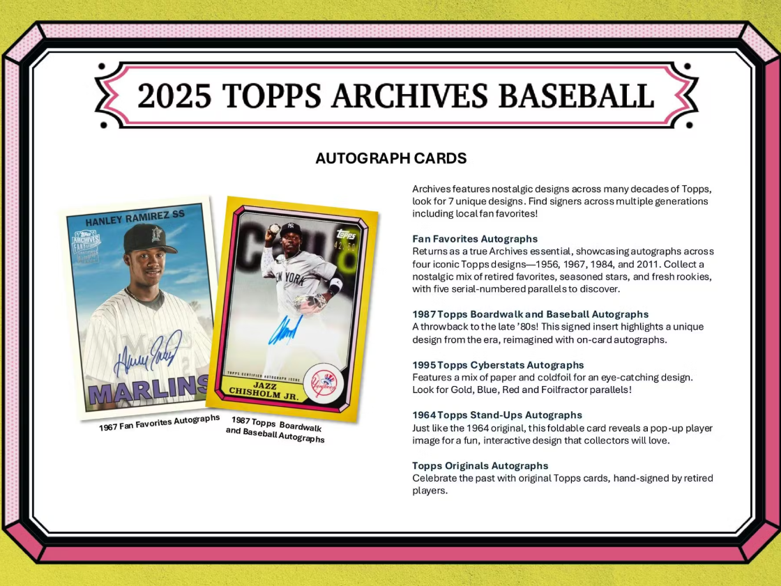 From retro base card designs to collector-favorite autos, Archives celebrates the decades that built the Hobby in every pack.