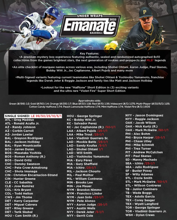 Supplying stylized designs, the 2025 Fanatics Under Wraps Emanate MLB Autographed Photo checklist leans into the card collecting approach, offering limited parallels and multi-signed photos in a blind-bag format. All signatures are authenticated by Fanatics and MLB.