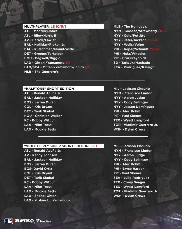 However, some of the bigger names don't have the complete run of choices, such as Aaron Judge (/25 or less), Mike Trout (/25 or less), Shohei Ohtani (1/1) and more. These are noted on the checklist below.