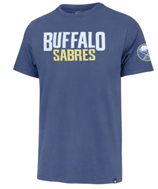 Rock the ice with this '47 Brand Buffalo Sabres tee in crisp cadet blue. The Franklin Fieldhouse design brings vintage hockey vibes straight to your everyday rotation. Perfect for die-hard Sabres fans who want to rep their team with style and comfort. Whether you're heading to the rink or just showing your colors around town, this classic tee delivers that authentic sports heritage you're looking for.