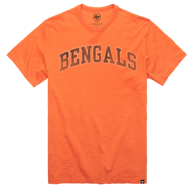 Show your Cincinnati Bengals pride with the '47 Brand Carrot Grit Wordmark Scrum Tee. Crafted for comfort and style, this t-shirt features a bold wordmark design in the team’s signature colors. Its soft fabric and relaxed fit make it perfect for game days or casual wear, offering both durability and breathable comfort. Ideal for dedicated fans seeking quality and authentic team spirit.