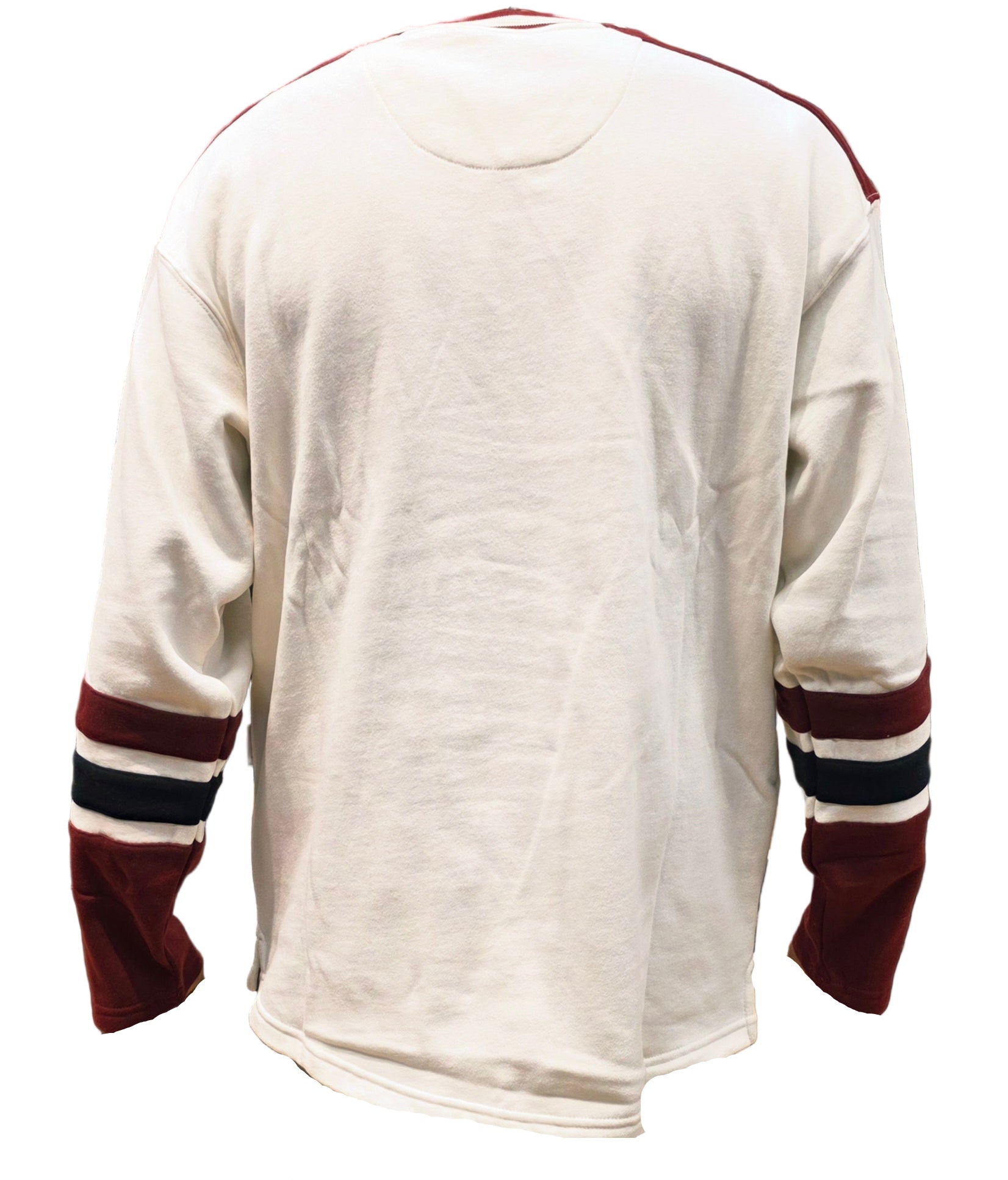 The Benchmark Netminder '47 Pullover is a comfortable midweight fleece pullover with twill appliquéd logos, layered sleeve stripes, and the historic NHL shield.
