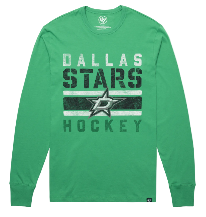 Gear up in true Stars style with this '47 Brand long sleeve tee featuring the iconic Dallas Stars logo in rich orchard green. The Franklin design delivers classic hockey heritage with a modern edge, perfect for die-hard fans and casual supporters alike. Crafted for comfort and durability, this tee layers beautifully under jackets or stands solo as your go-to game day essential. Show your team pride all season long.