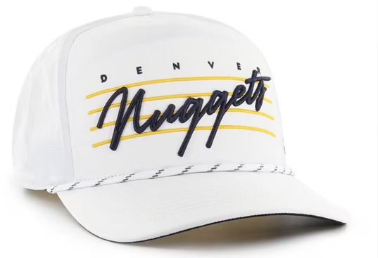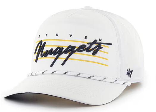 This Denver Nuggets White Adjustable Hat features a front embroidered cursive wordmark with rope across visor and back snap closure.
