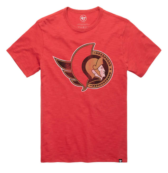 Gear up in vintage hockey style with this '47 Brand Ottawa Senators tee. The bold Rescue Red colorway channels classic arena energy, while the Grit Scrum design delivers authentic throwback appeal. Perfect for die-hard Senators fans and retro sports enthusiasts who want to rep their team with attitude. Comfortable, durable, and ready to turn heads at the game or around town.