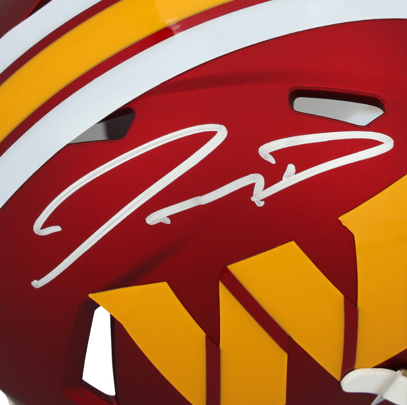 Elevate your collection of Washington Commanders memorabilia with this Jayden Daniels autographed Riddell 2025 Alternate Speed Mini Helmet. The eye-catching team details are complemented by the star quarterback's distinct signature, bringing your favorite team and one of its biggest stars right into your home. This helmet includes an individually numbered, tamper-evident hologram that can be authenticated with FanSecure technology and verified online.