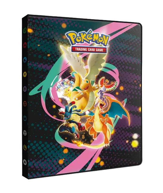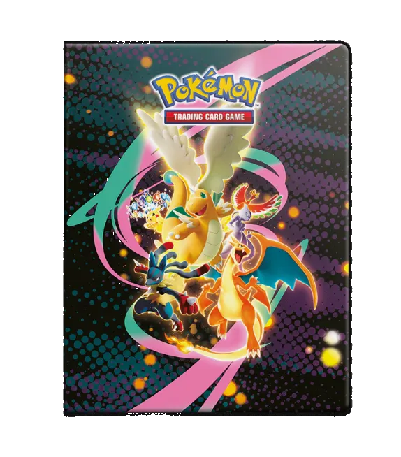 - Officially licensed Pokémon Trading Card Game 9-Pocket Portfolio featuring Mega Dragonite, Mega Charizard, Mega Lucario, Mewtwo, Ho-Oh, and Stellar-type Terastallized Pikachu