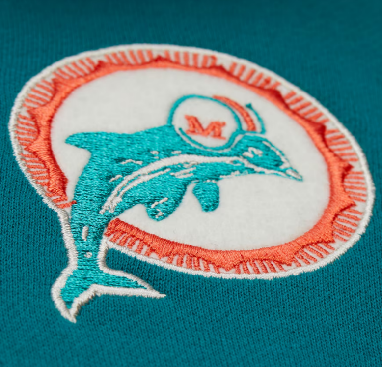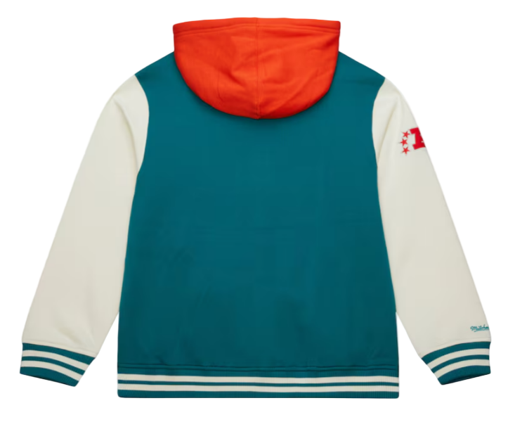 Gear up for gameday with this Miami Dolphins Sideline Fleece Full-Snap Jacket. Featuring embroidered fabric applique graphics, this jacket is the perfect way to represent your favorite NFL squad. With cozy fleece lining, rib-knit trims and an adjustable drawstring hood, it's a must-have for any dedicated Miami Dolphins fan.