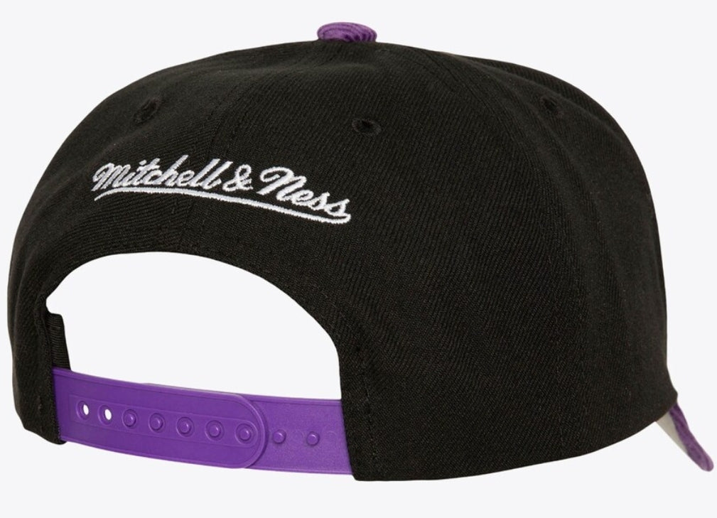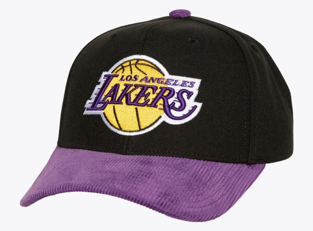 This black corduroy snapback cap from Mitchell & Ness features the iconic Los Angeles Lakers logo and is perfect for any basketball fan. Its durable design and timeless style make it a must-have accessory for game day or everyday wear.