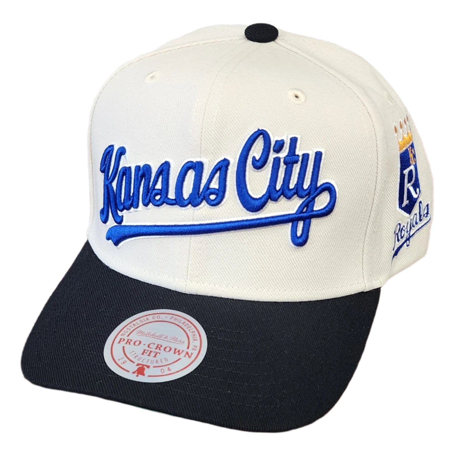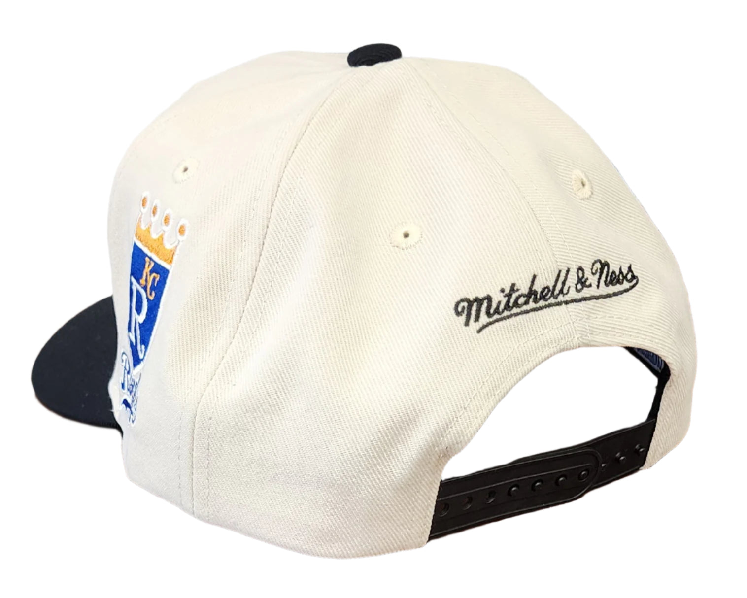 This Mitchell & Ness snapback features an off-white color and embroidered Kansas City Royals logo. Part of the Cooperstown Collection, it's a stylish and classic addition to any sports fan's collection. Made with quality materials and craftsmanship, it's a must-have for any baseball enthusiast.