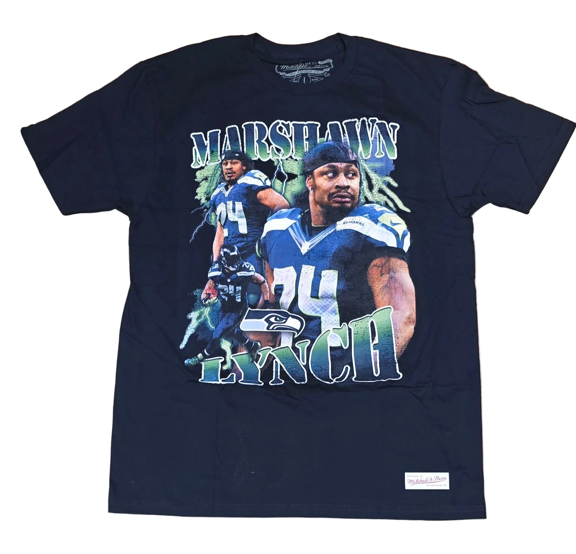 Celebrate one of the Seahawks' most legendary running backs with this Mitchell & Ness collage stats tee. Featuring Marshawn Lynch's iconic image alongside his impressive career statistics, this vintage-inspired design captures the essence of "Beast Mode" in action. Perfect for die-hard Seattle fans and NFL nostalgia lovers, this premium tee combines comfort with throwback style. Whether you're heading to the stadium or just showing your team pride, this collectible piece honors one of football's most electrifying players.