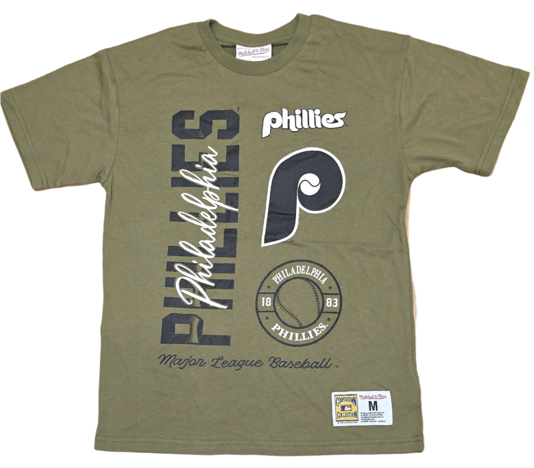 The Mitchell & Ness Youth Olive Green Philadelphia Phillies Stacked Tee combines classic team spirit with a unique olive green hue, perfect for young fans seeking a distinctive look. Designed with quality materials, this tee ensures comfort and durability for active wear. Its bold Phillies logo prominently displays team pride, making it an ideal choice for game days or casual outings.
