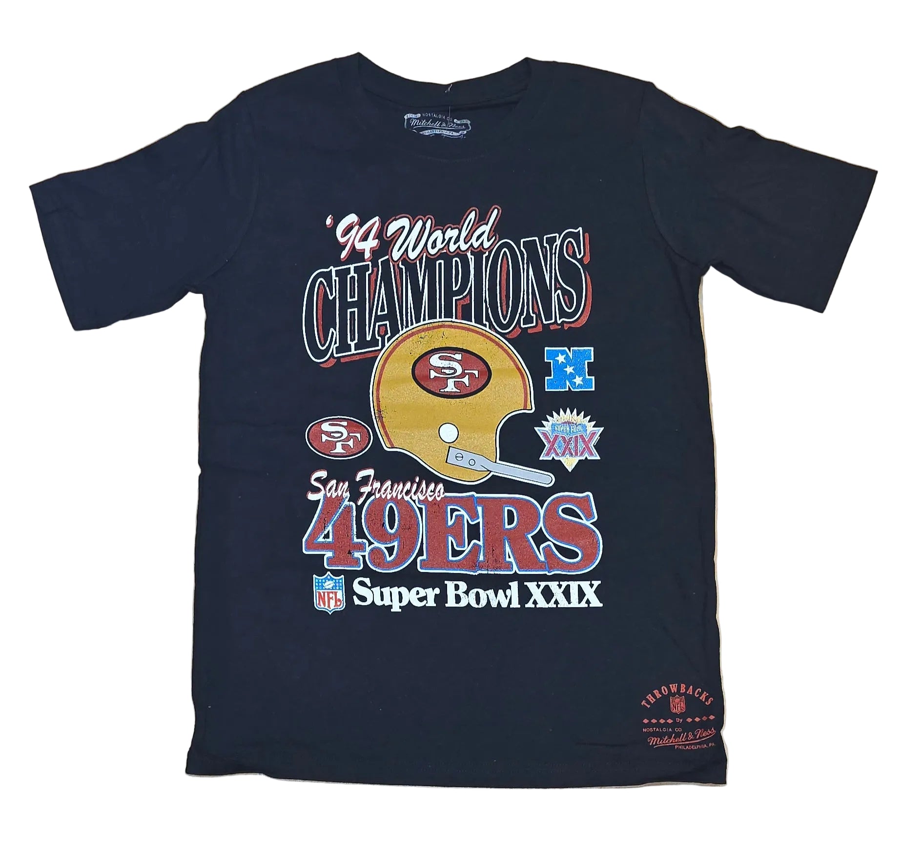 Score big with this Mitchell & Ness Youth San Francisco 49ers Helmet of Champions tee! Featuring iconic 49ers graphics that celebrate championship glory, this tee brings vintage sports style to young fans. Soft, comfortable fabric keeps kids feeling great whether they're cheering from the stands or showing off their team pride at school. Perfect for any 49ers enthusiast ready to rep their squad in style.